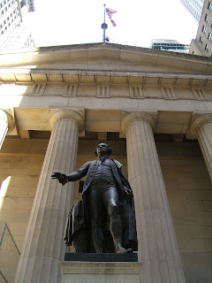Leaving Trinity, you cross Broadway and start down surprisingly nondescript Wall Street. Just one block onto it, with Trinity’s steeple looming behind you, you come to the site where George Washington took the oath of office as America’s first president: